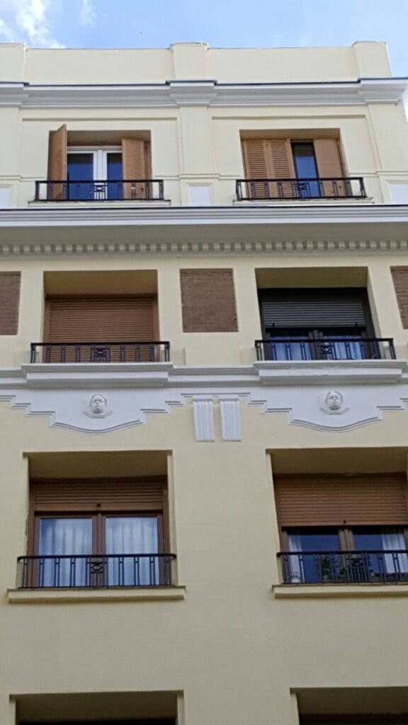 Restauración completa de fachada sobre andamio incluso la recuperación de molduras y ornamentos decorativos, recuperación de revocos tradicionales. También se realizó la pintura y mejora del portal y comunes de la finca.