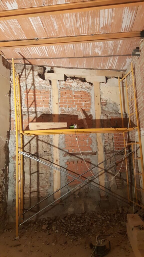 Rehabilitación estructural de edificio incluyendo el cambio de todos los pies derechos de madera por otros nuevos.